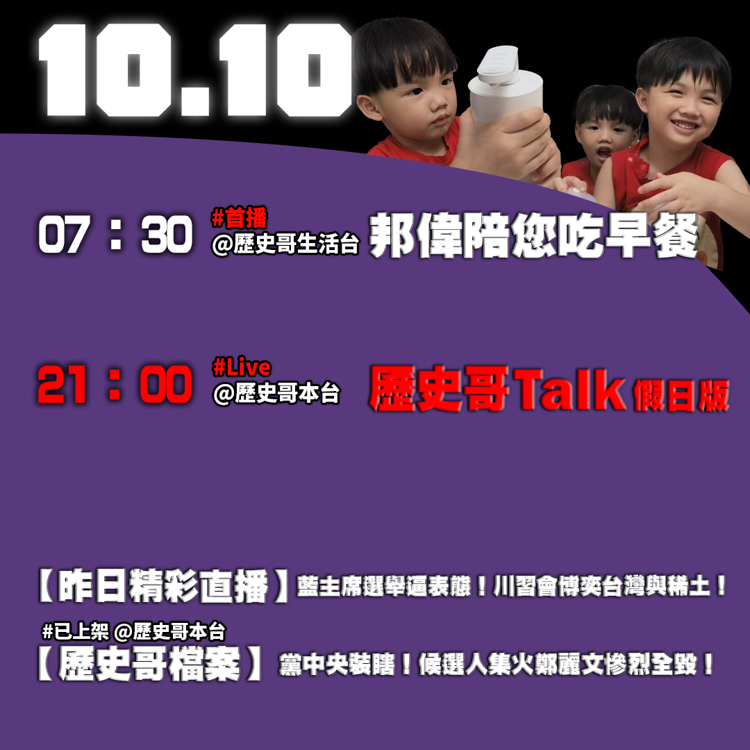 【10/10(五)歷史哥李易修忙什麼?】 07:30 公司庶務小能手 洗手機自己換EP1 21:00【歷史哥Tal…