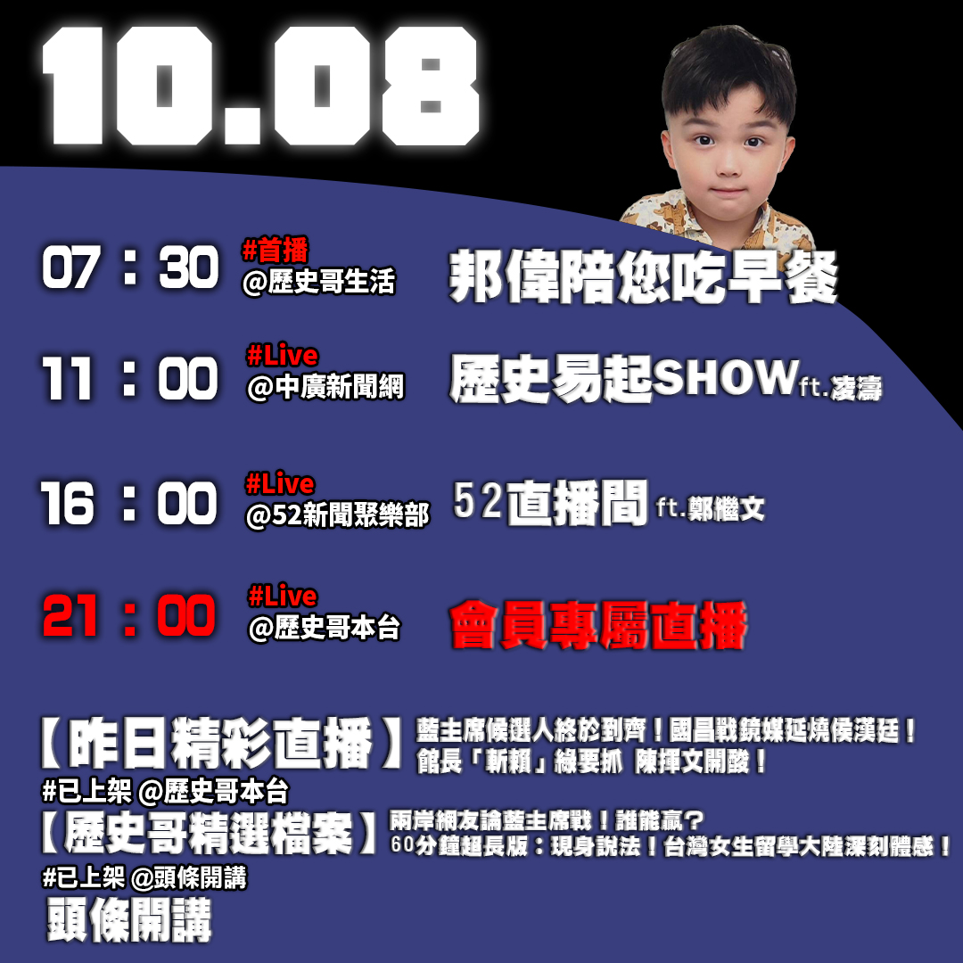 【10/8(三)歷史哥李易修忙什麼?】 07:30 鞦韆盪高高 最佳推手邦偉阿爸 11:00 【中廣直播|桃園市…
