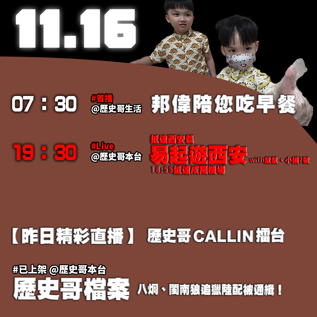 【11/116(日)歷史哥李易修忙什麼?】 07:30 打掃衛生 保證完成任務 19:30【易起遊西安 Day …