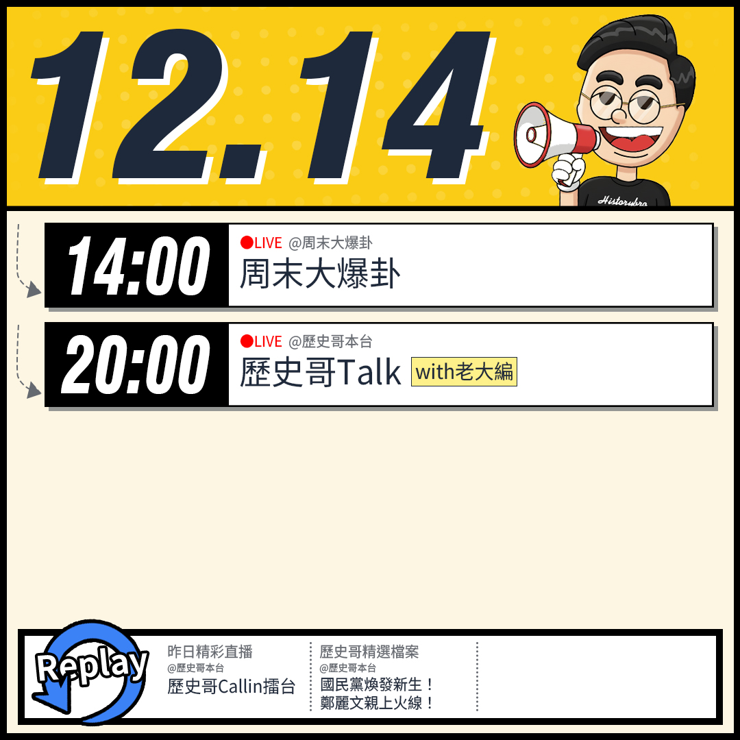 【12/14(日)歷史哥李易修忙什麼?】 14:00 【中天直播:周末大爆卦】 %E5%A4%A7%E6… 20:0…