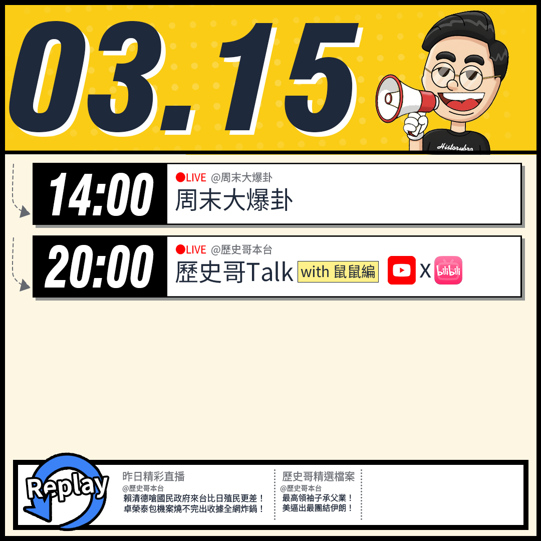 【3/15(日)歷史哥李易修忙什麼?】 14:00 【中天直播:周末大爆卦】 20:00【歷史哥Talk|華文圈知…