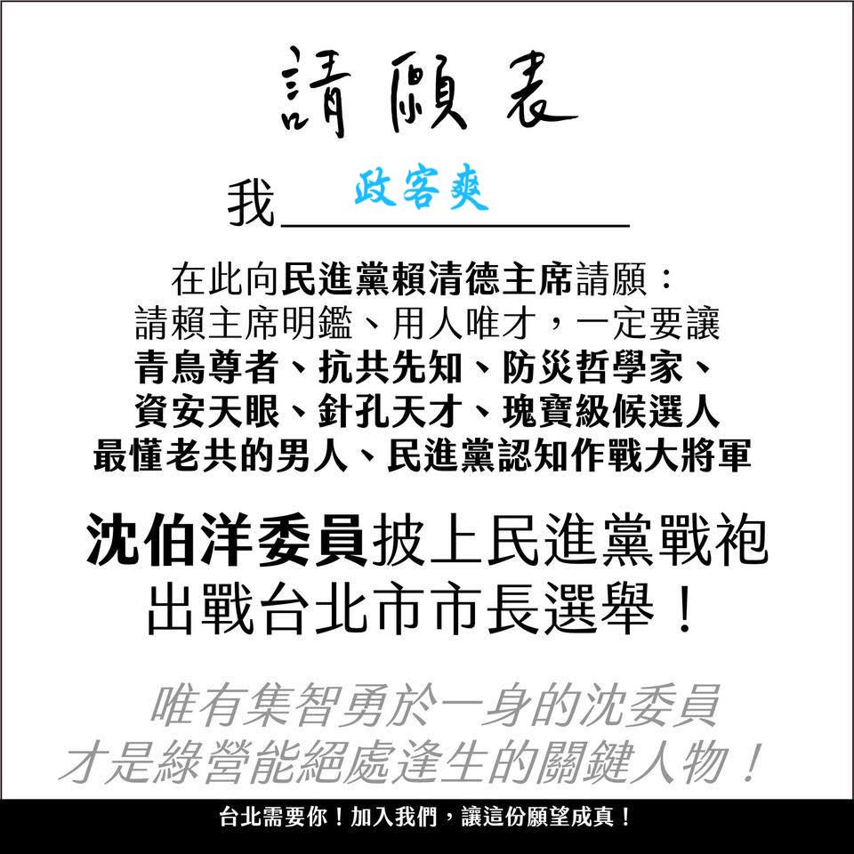 中共無情打壓沈伯洋,大家一起揭竿起義力挺沈伯洋代表民主進步黨參選台北市長。 勇者無懼,沈伯洋應該聽從曹興誠的建議,挺身參選義無反顧。 響應楊智伃的發起,讓大聰明沈伯洋打爛台北市每一台的針孔攝影機。 轉載來源