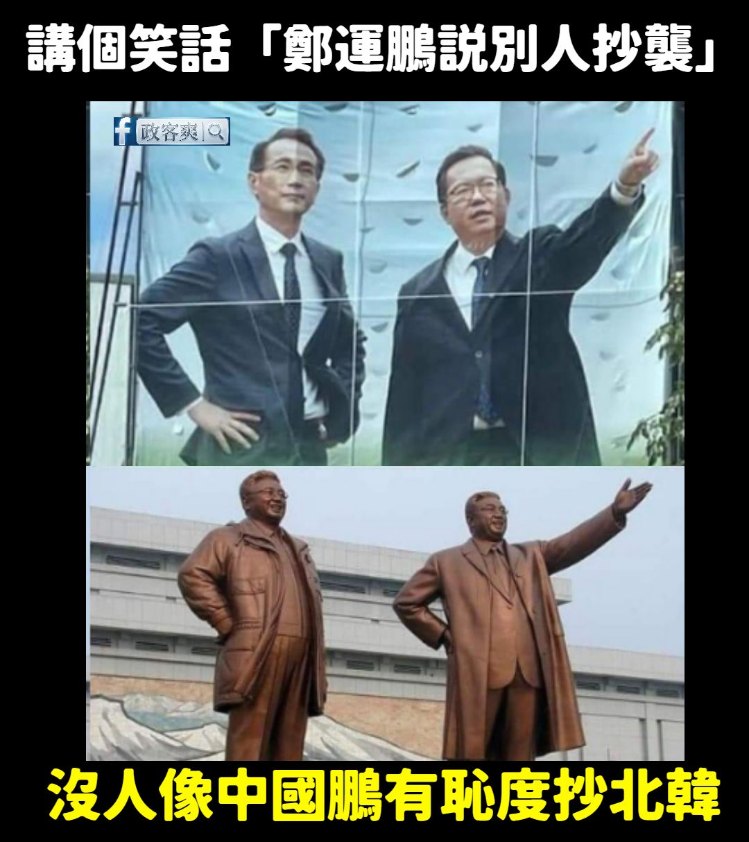 中國鵬最愛抄北韓 昨天鄭運鵬跟著青鳥一起嘲諷李四川抄襲他「拿鐵鎚的照片」,結果被我抓包北韓幾十年前就有拿鐵鎚的宣傳繪圖。 而在2022年鄭運鵬選桃園市長的時候,他跟鄭文燦的合體看板,跟北韓領導人金日成、金正日的銅像87%像。 不愧綠共,連北韓共產黨都要抄。 轉載來源