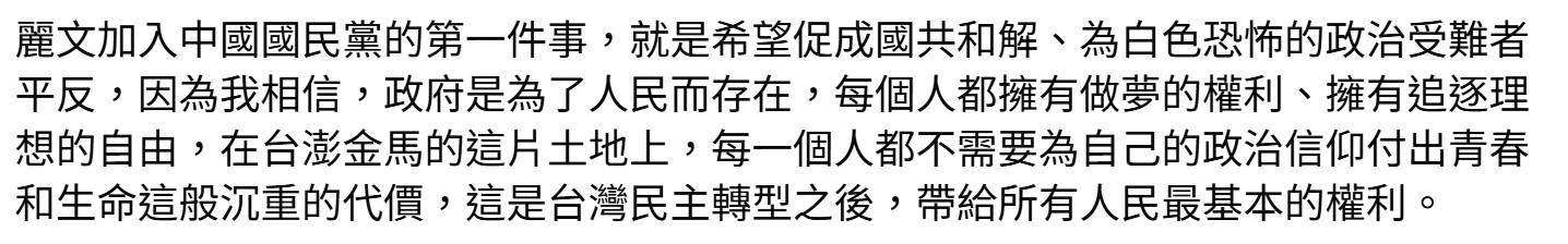 「麗文加入中國國民黨的第一件事,就是希望促成國共和解…(以下全省略)」