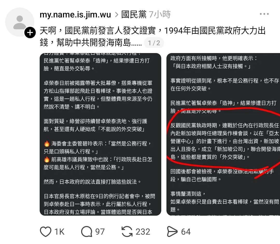 冷知識:1994年總統是阿輝,阿輝的口號叫「經營大台灣,建設新中原」,因此往西邊發展,在當年連馬桶都沒有的對岸,跟新加坡… 黑特民進黨 2026-03-12 黑特 留下回應 2 點擊數 冷知識:1994年總統是阿輝,阿輝的口號叫「經營大台灣,建設新中原」,因此往西邊發展,在當年連馬桶都沒有的對岸,跟新加坡合資拓荒也還算合理吧? 來源摸我 分享文章 Facebook Twitter