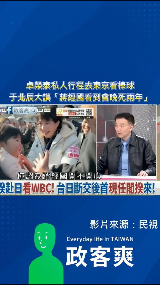 卓榮泰私人行程去東京看棒球,于北辰大讚「蔣經國看到會晚死兩年」 厲害了,于北辰不只是數學鬼才、歷史專家,更是能夠讓蔣經… 黑特民進黨 2026-03-10 黑特 留下回應 2 點擊數 卓榮泰私人行程去東京看棒球,于北辰大讚「蔣經國看到會晚死兩年」 厲害了,于北辰不只是數學鬼才、歷史專家,更是能夠讓蔣經國延年益壽的神仙。 轉載來源 分享文章 Facebook Twitter