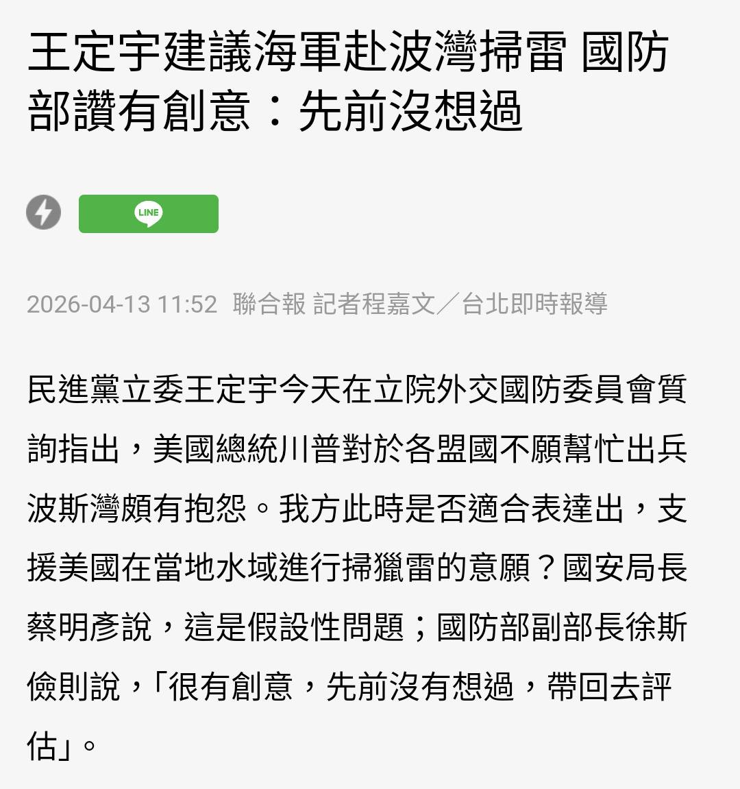 國軍很忙,建議派王定宇本人去掃,他如果掛了我們可以像柬埔寨紀念掃雷鼠那樣幫他在台南立一個紀念銅像。 本屆立法院的水準真的很差,都是哪裡來的牛鬼蛇神齊聚一堂?