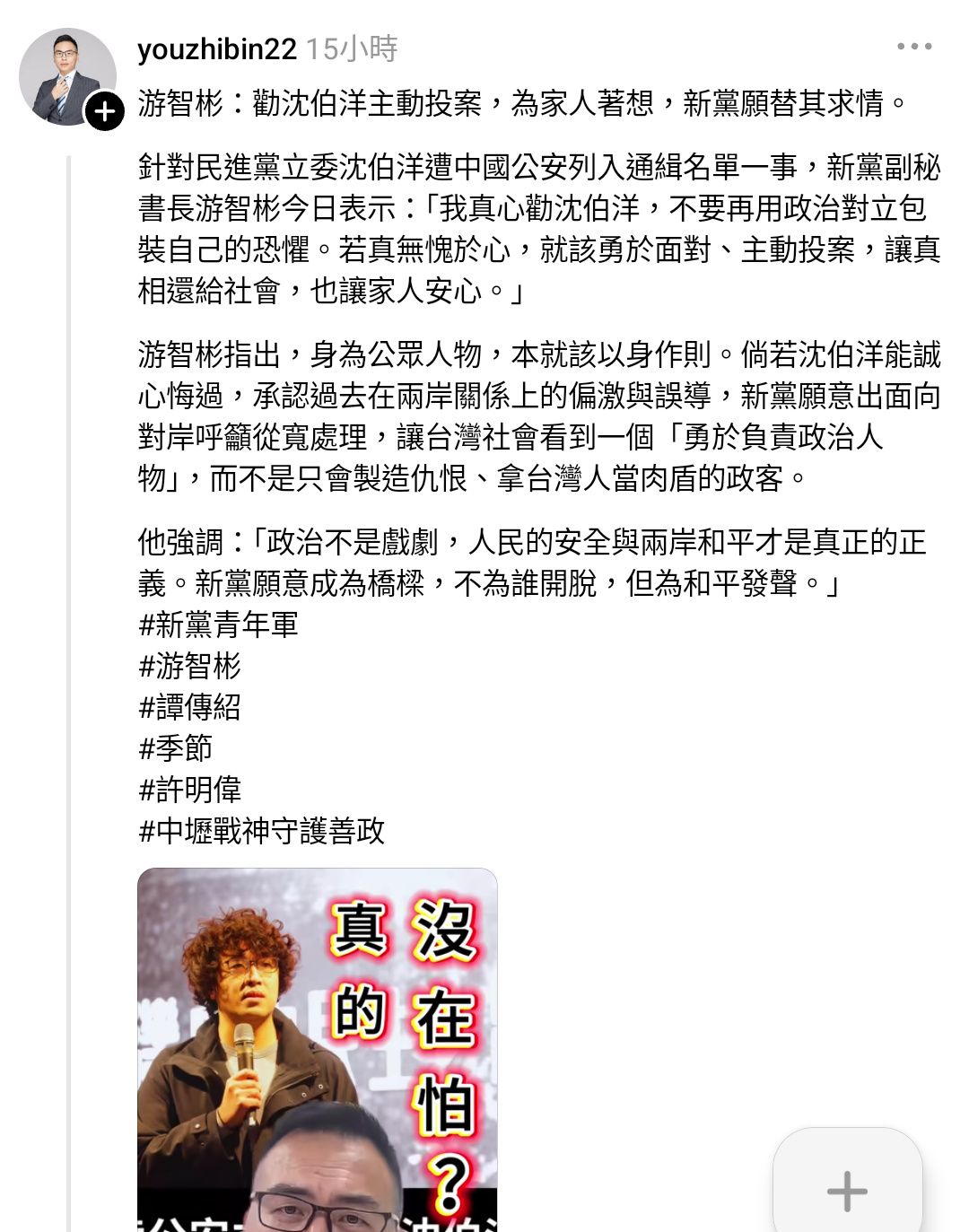 大家都知道我對淘寶代理商沈仆馬從來是沒有什麼好話的,今天竟然能讓我看到一個比仆馬還噁心的也是不容易。#拿匪區的偽法來要脅我國國民?依照新党這位天才的說法,是不是之前被共匪自行列為台獨的國軍也要「主動投案」?也要靠他們這些三腳仔「幫忙求情」?