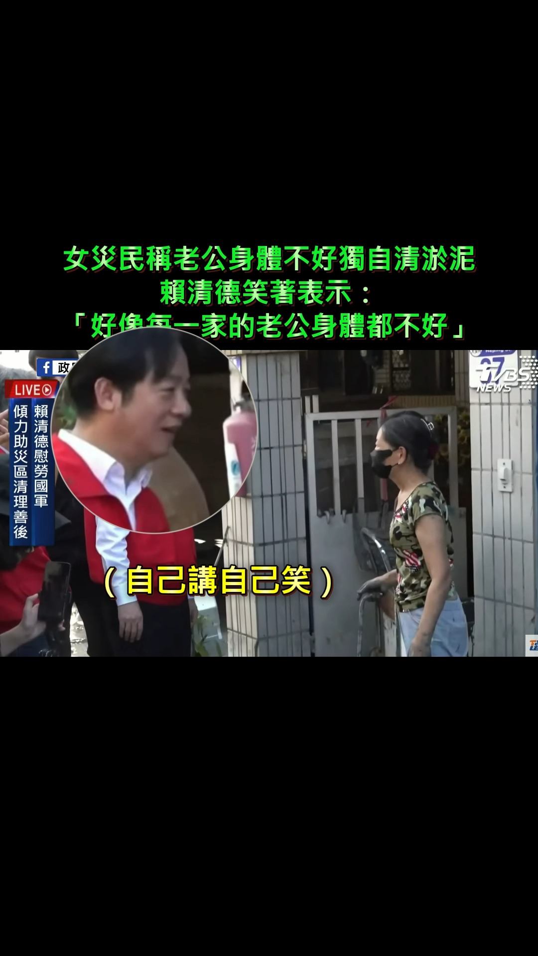 女災民稱老公身體不好獨自清淤泥,賴清德笑著表示:「好像每一家的老公身體都不好」 隨後女災民沒有笑容,繼續表示:「沒辦法…