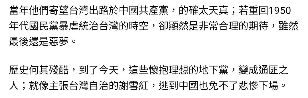 寫出這種聖母文的人通常都不知道共慘黨做過什麼。 #任何一個價值觀正常的台灣人但凡知道千分之一共產黨在1950至1980之間曾經做過的事,都不會對共匪有一絲同情,反而會對多年來被誤解的老蔣感到同情。 如果沒有老蔣拼命守住這裡,我們全部都得跟著經歷一遍。