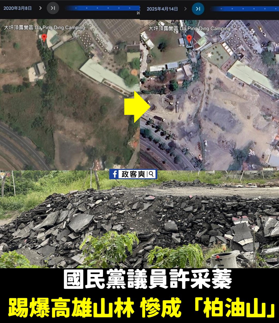 小港區大坪頂保護區也淪陷,從綠意盎然的山林慘變「柏油山」,大量廢瀝青與廢棄物堆置其中。 高雄繼大峽谷後,喜迎柏油山。 …