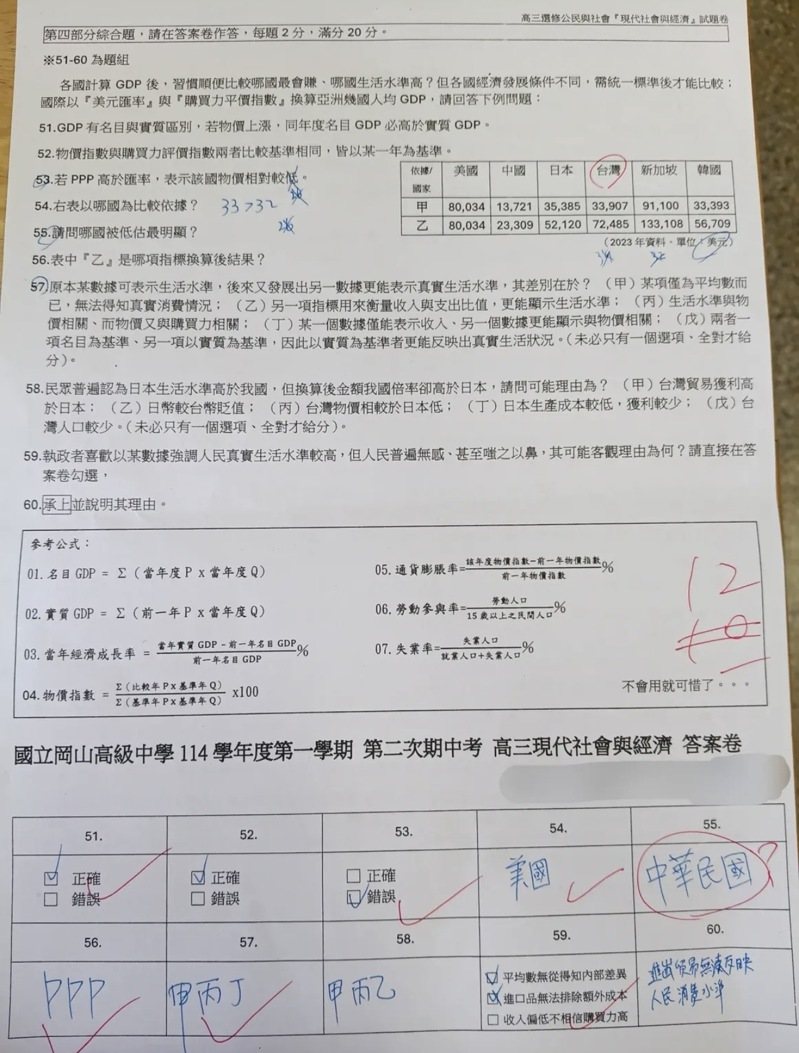 岡山高中學生爆試卷寫「中華民國」被扣分? 校方澄清:已補回成績。 圖/翻攝自Threads
