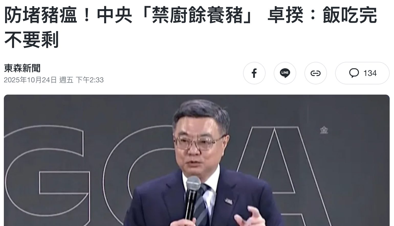 為了防堵豬瘟疫情擴大,業者禁用廚餘養豬。行政院長卓榮泰向國人喊話,用餐請吃完,不要製造廚餘。