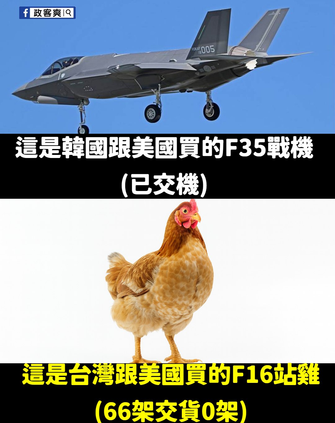 建議既然F16付了錢,5年來66架交貨0架。 不如我們跟美國採購66隻站雞,至少這樣在野黨也沒什麼好說嘴的。 轉載來源