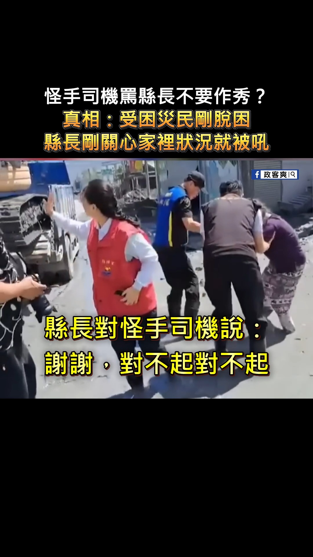 怪手司機罵縣長不要作秀?真相:受困災民剛脫困,縣長關心災民家裡狀況就被吼 很多綠營側翼截取後面畫面下標「怪手司機罵縣長…