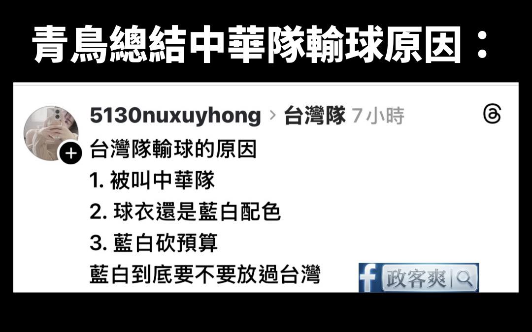 我也來總結一下中華隊輸球的原因: 1.賴清德團結十講沒有講完 2.民進黨還沒徵召王義川選桃園市長 3.王定宇失去了台南裕孝路豪宅的門禁卡 4.王定宇連續兩天沒發早安圖了 5.大罷免沒有大成功 6.(請填空) 轉載來源