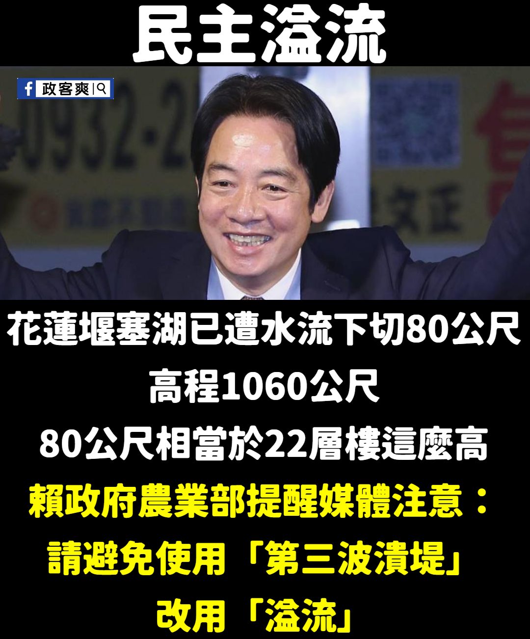 搶救災情重要,但用詞更重要,請大家告訴大家,要用「溢流」,不要用潰堤。 黨積極帶領國家解救水深火熱的花蓮同胞,在這個緊…