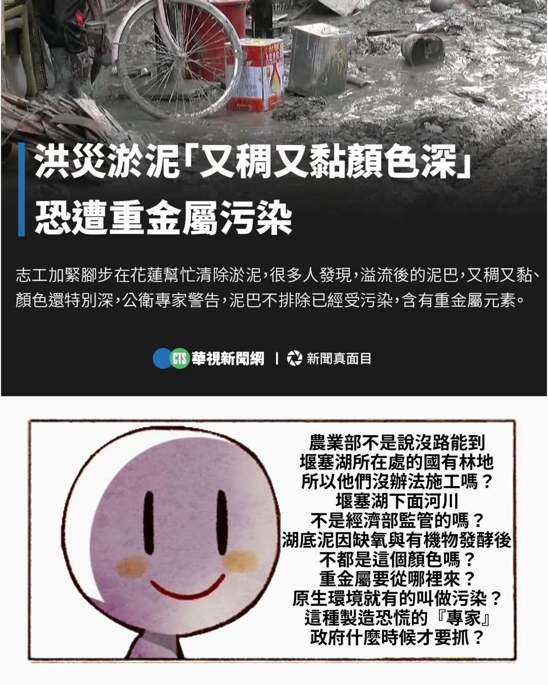 新聞原文:公衛師示警泥沙型的災害,絕對不能掉以輕心,因為台灣東部屬於變質岩環境,含有高背景值的重金屬,遇到災害更容易釋出,溢流當下挾帶大量土石沉積物,往下游不斷沖刷,再把這些重金屬,帶到周邊農田水源地,農藥肥料工廠油料等,讓居民二度暴露在風險中,包括飲用水農產水產品,都可能受到汙染,嚴重的話恐怕造成神經毒性疾病,甚至提高致癌可能性。