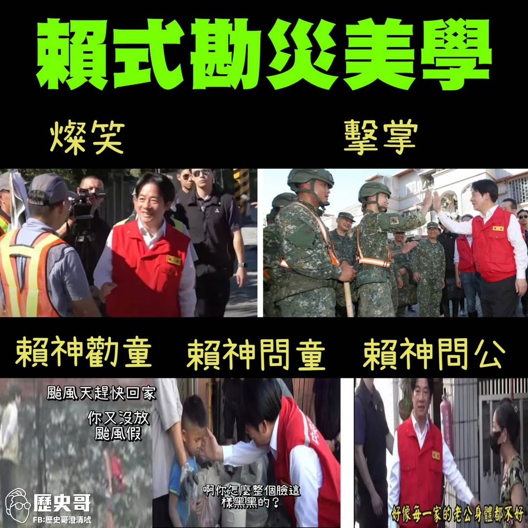 昔有勸童 有國軍勿進房、屋頂自己爬 現有擊掌、燦笑 賴神三問:回家乎?臉黑乎?老公身體好乎? 黑人問號???
