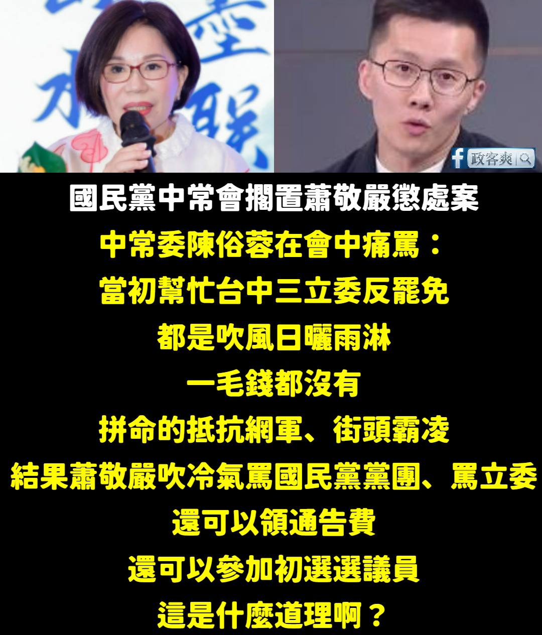 而在昨日中常會中,反對蕭敬嚴繼續參選的其中一位中常委叫陳俗蓉,她痛罵的內容,基本上也就是蕭敬嚴引起眾怒的原因之一。