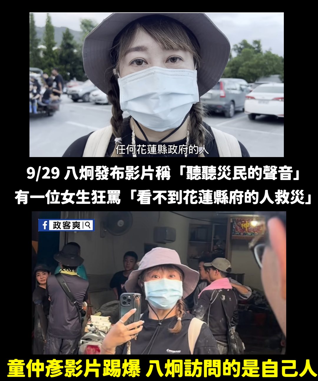9/29 八炯發布一支影片,標題為「前進花蓮災區!聽聽災民的聲音,光復最真實的樣貌,台灣各地志工來支援」