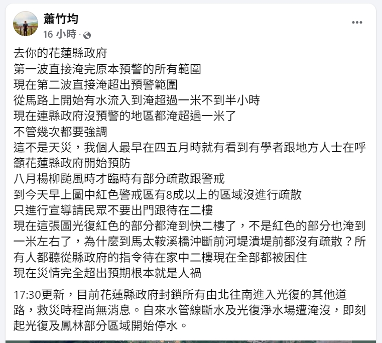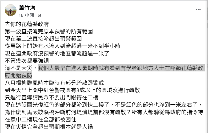 馬太鞍溪上游的堰塞湖溢流,大水沖進光復市區造成嚴重災情。這傢伙第一時間就跑出來去他的花蓮縣政府。我必須說,最壞的就是這種人。