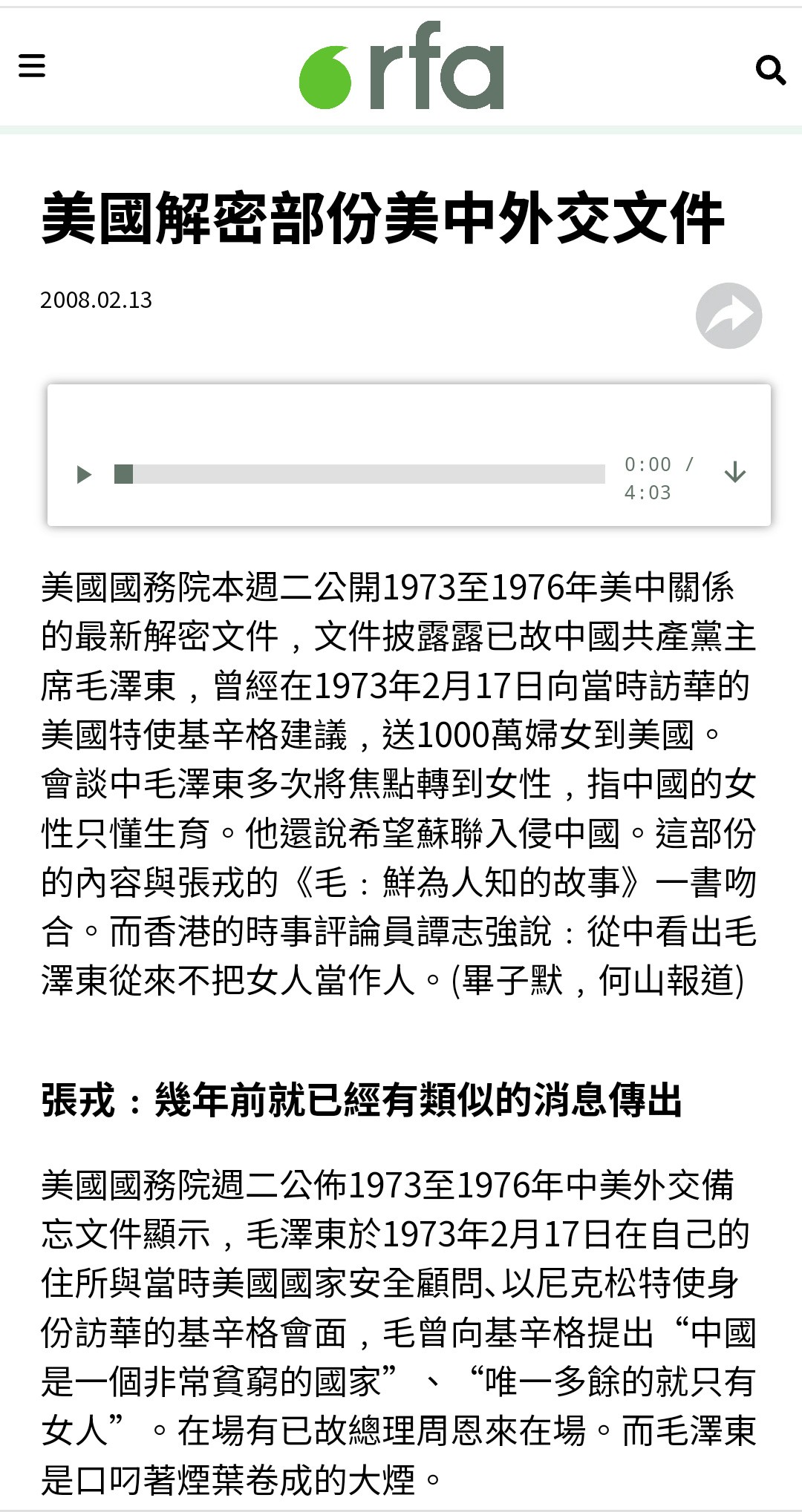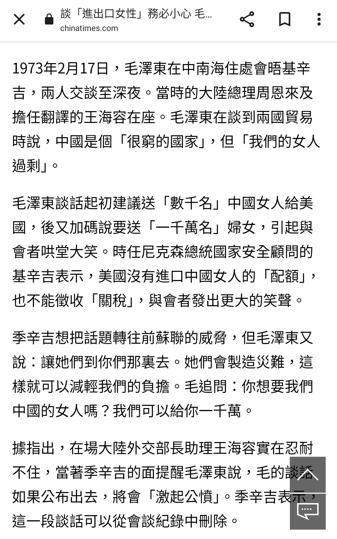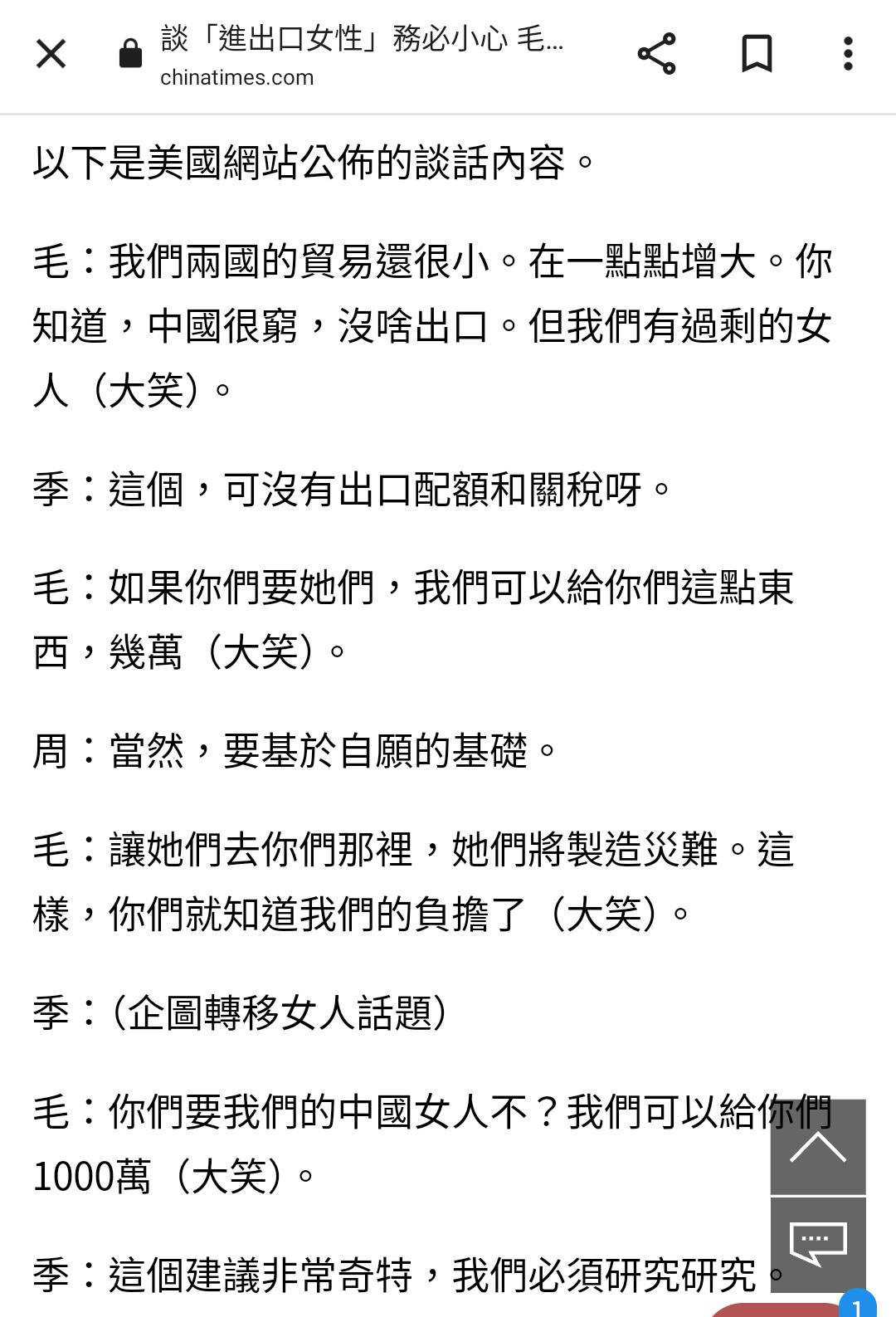 這時候可能會有粉紅抗辯:這些都是民間的事情,怎麼能怪給党呢?那不好意思,依據美國到期解密的文件,毛澤東甚至 #當面向美國人提議要贈送一千萬中國婦女給美國,只是被美國人婉拒了,這可不是戰爭中被敵國擄走當慰安婦,是承平時代差點被國家領導主動提議送去當慰安婦。