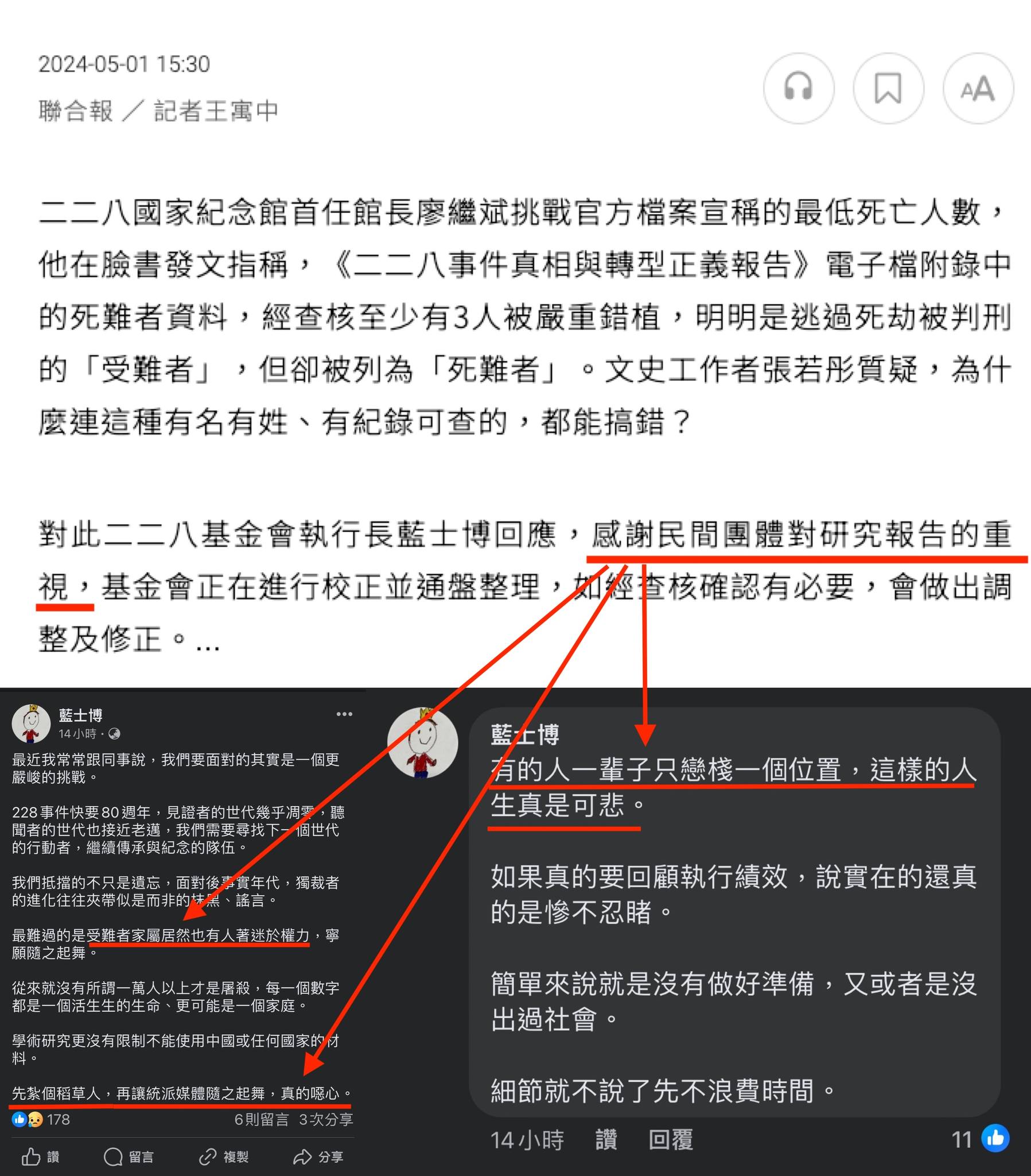 我們得到的,只是二二八基金會執行長 #藍士博 在他臉書罵人「噁心」、「一生只戀棧一個位置這樣的人生真是可悲」、「受難者家屬居然也有人着迷於權力」。(如圖)