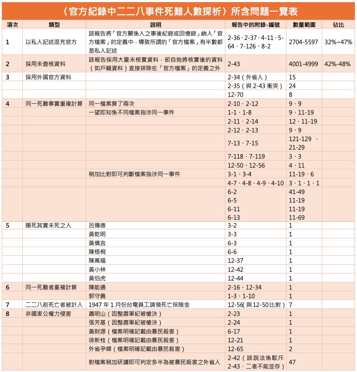我們兩年前花了大把的時間、金錢、精力,寫了報告、辦了活動、做了簡報、找了記者,把基金會的轉型正義總結報告所推估的死難數字,一項一項的錯誤具體指出來,還分門分類(如圖),結果還要被你葉先生教育我們「理應指出具體個案,例如重複列計、證據來源失真、審查標準偏離既定規範」,感嘆「公共討論偏離證據原則」、「要回到資料與方法本身」?