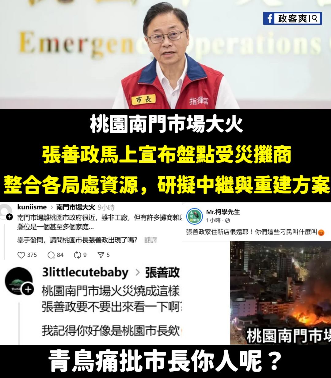 桃園南門市場大火,張善政第一時間就宣布處置方向 但在青鳥的異想世界中,市長應該是拿著滅火器去現場救火。 提醒一下,火勢還沒完全撲滅時,去現場幾乎沒意義,甚至造成困擾,官員或媒體進場會干擾救災節奏。 就算火勢剛撲滅在警戒期,過去也是多餘。 專業的人做專業的事情,做為領導者該做的是統籌工作,不是作秀,青鳥大概已經習慣政治人物要去做秀這件事了。 轉載來源