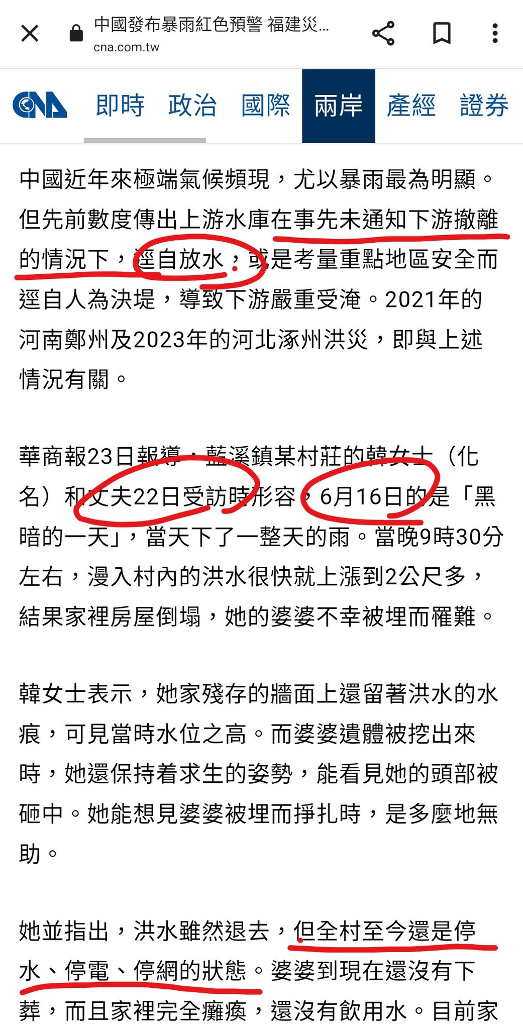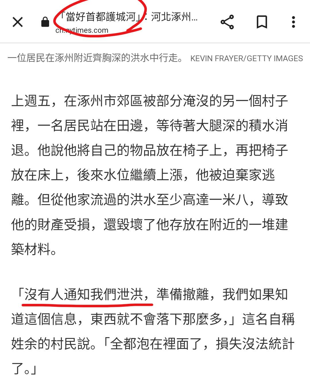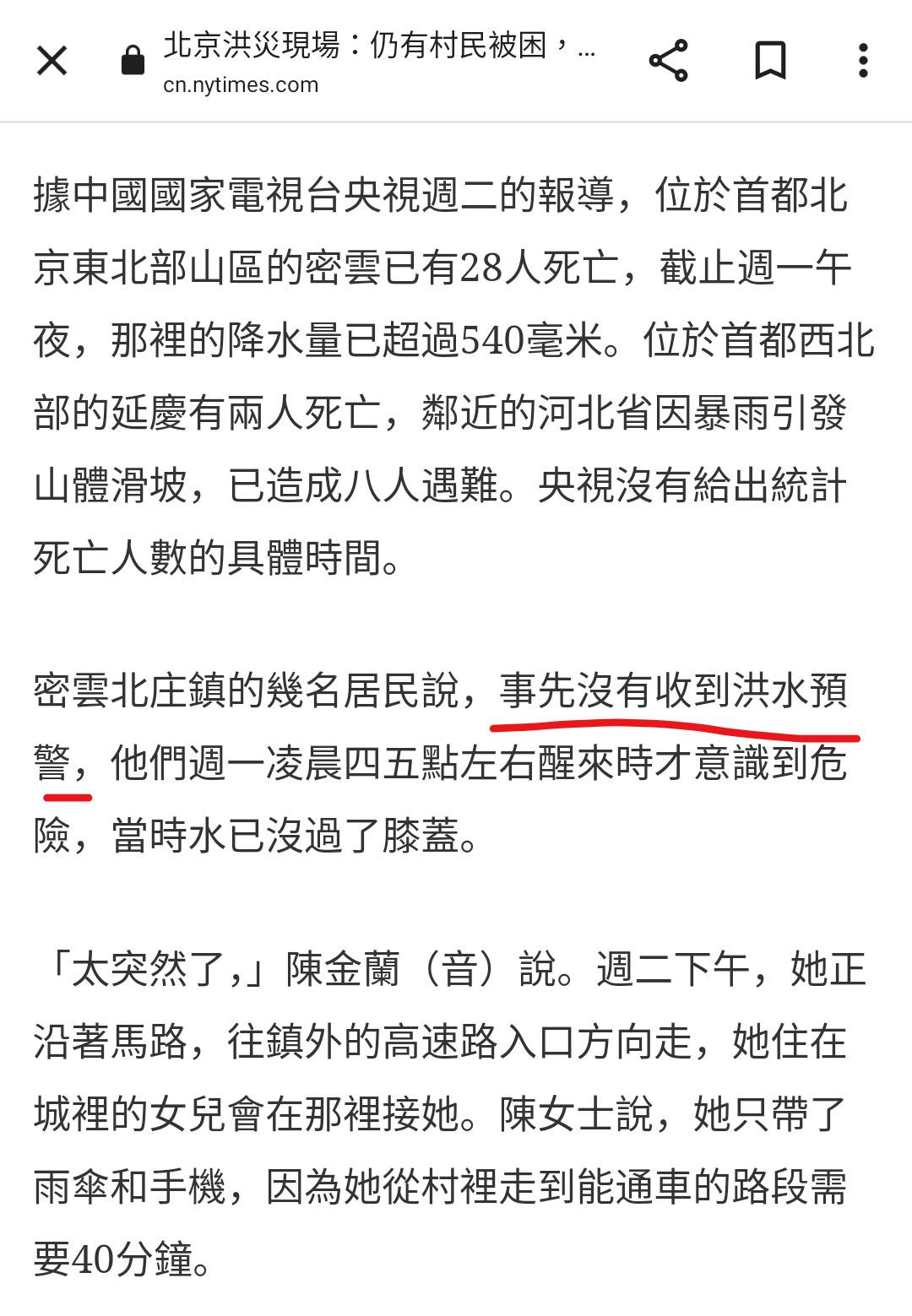 這次災情也一樣,說的一嘴好防災,好像忘了是誰為了北平不淹水要求周圍「當好北京護城河」,無預警洩洪把周遭區域當成滯洪池,造成30萬人受災,也忘了今年六月福建水庫也來這一招淹掉一堆人,災後一週仍然停水停電?(說好的匪軍救災很厲害?)八月密雲水災,連警報都沒有發?