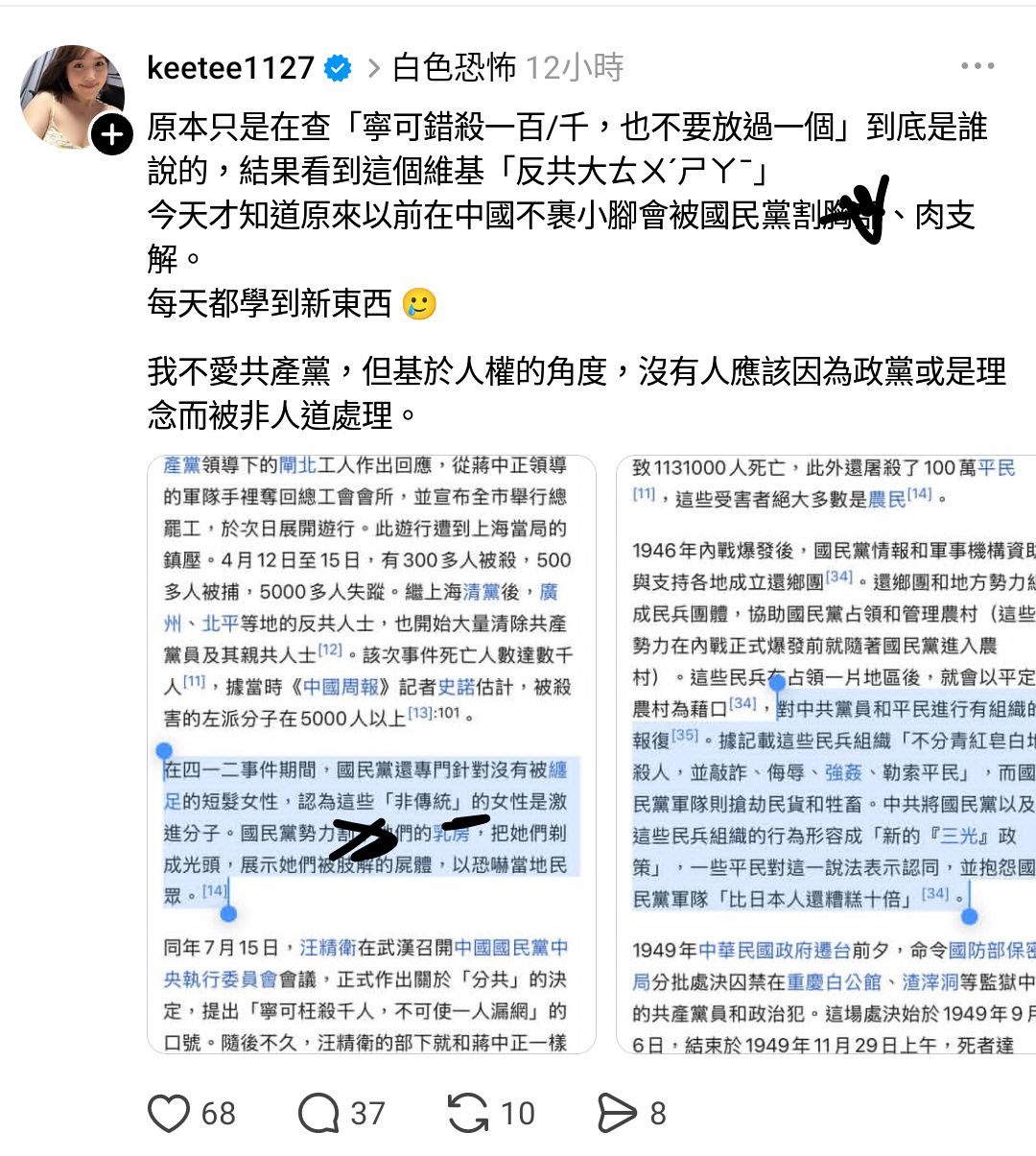 民國114年還能看到 #共產黨支持者在造謠國民黨 我是沒想到的,雖然大家都知道綠營的陳年謠言多半是拿共產黨的來用,但是這麼明明白白地共產黨支持者親自下場造謠,把澎湃之流對付地主的手段拿來張冠李戴栽贓給國民黨,現在是嫌綠營不給力所以要親自指揮、親自發文了是嗎?