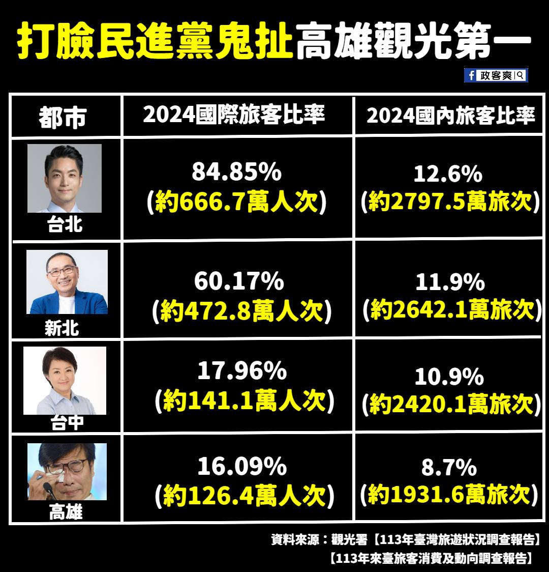 用佔比來計算各城市的旅次,高雄也只占8.7%(約1931.6萬旅次),比台南9.8%(約2175.8萬旅次)還低,所以高雄是怎麼成為民進黨口中的全國第一的?