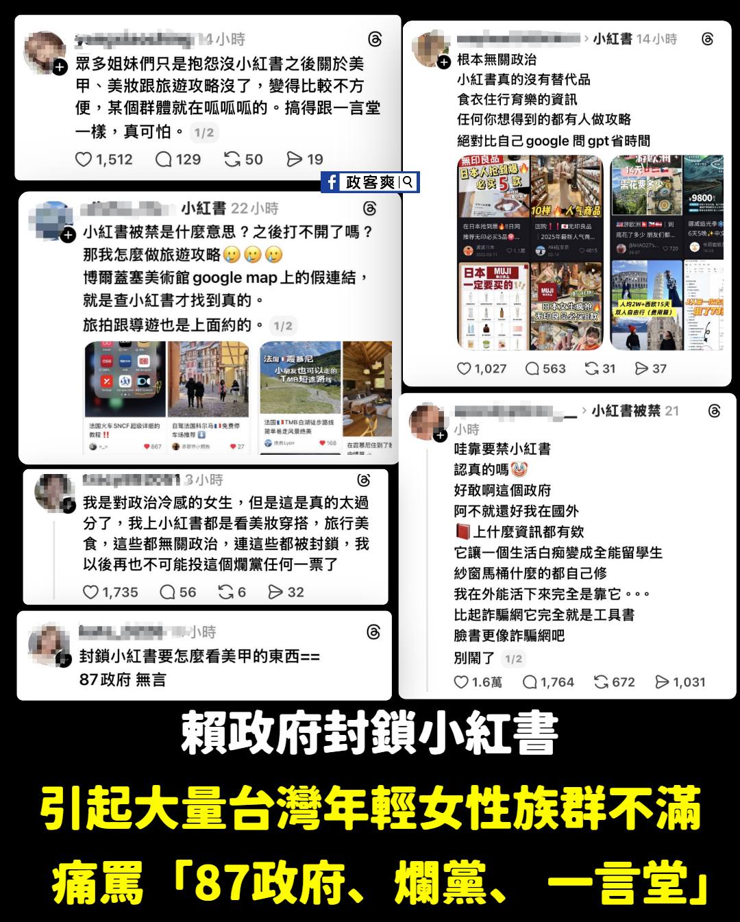 炸鍋囉~現在很多年輕女性族群對小紅書被封鎖很有意見 事實上現在很多年輕族群的用戶,在食衣住行旅遊上對於小紅書有較多的使用,很多人出國旅遊做功課也是用小紅書。 現在注意到的是很多「對政治無感」的人也很不爽,民進黨可以繼續瘋下去,反正大罷免你們也是覺得全台灣人都支持你們,加油一定要堅持,多封幾個。 轉載來源