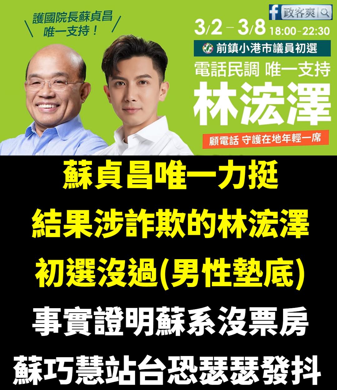 照理講,蘇貞昌在民進黨內也算人氣王之一,結果唯一力挺涉詐欺的議員林浤澤連初選都沒過,上次高雄市長初選力挺的邱議瑩也是初選沒過。 蘇系現在在民進黨內簡直是軟腳蝦,後續要被蘇巧慧站台的議員可能會瑟瑟發抖。 蘇巧慧至今都沒有對於他父親力挺涉詐欺的參選人發表看法,一個連公平正義都不敢捍衛的人,也沒什麼資格當新北市長。 轉載來源