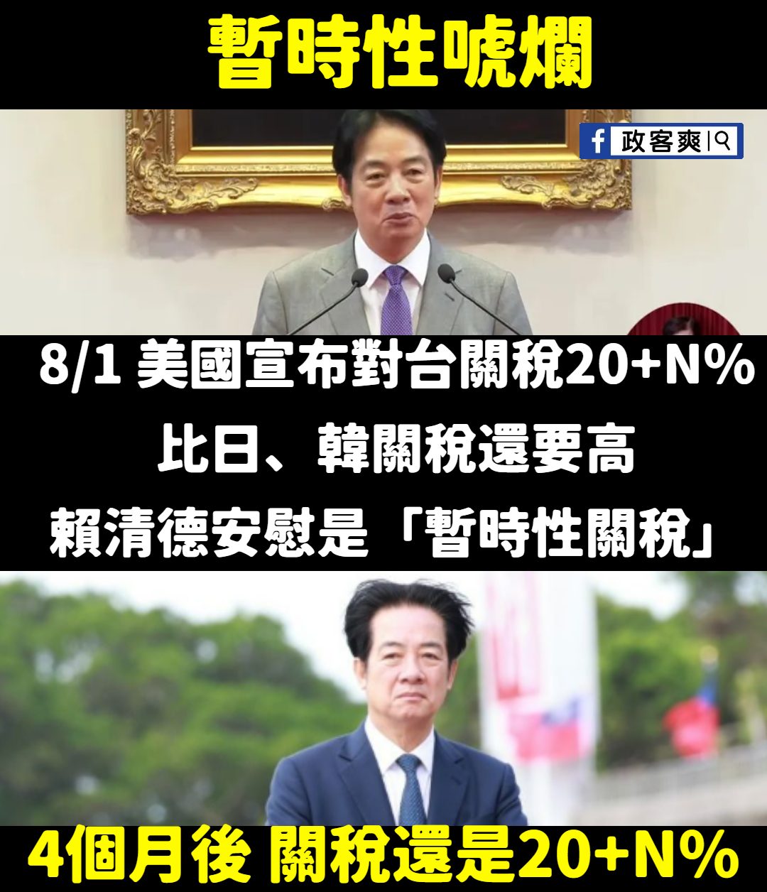 啊8/1賴清德聲稱20+N%的關稅是「暫時性關稅」,這個暫時性就長達四個月。