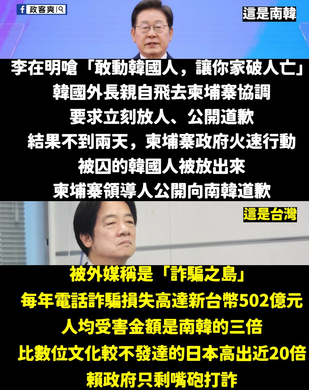 看看別人的總統,再看看賴清德只會整天要人鼓掌。 台灣才2300萬人,人均被詐騙金額比日韓還要高,真的是打詐打的再創高峰…
