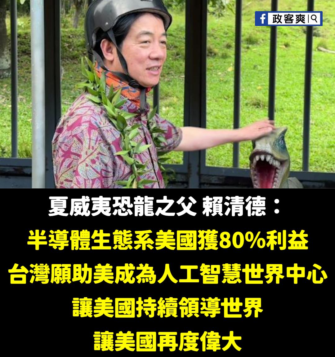 祝福賴清德競選夏威夷州長順利! 哦,原來賴清德是中華民國總統,但怎麼要讓美國再次偉大呢? 上次賴清德去美國只能去夏威夷慈愛的撫摸恐龍,進行了村長級外交。 相信這次發言,可以到黃石公園擔任園長。 對了,讓美國再次偉大,對台灣具體的幫助是什麼? 我目前看到四年採購100億美國農產品、台積電花上千億赴美設廠、關稅20+N%.. 轉載來源