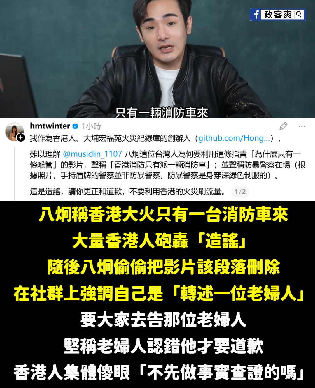 笑死,八炯繼抹黑鍾明軒裝死不道歉後,再度造謠香港大火「只有一台消防車來」,目前被大量香港人炎上要求道歉 這麼大型的翻車…