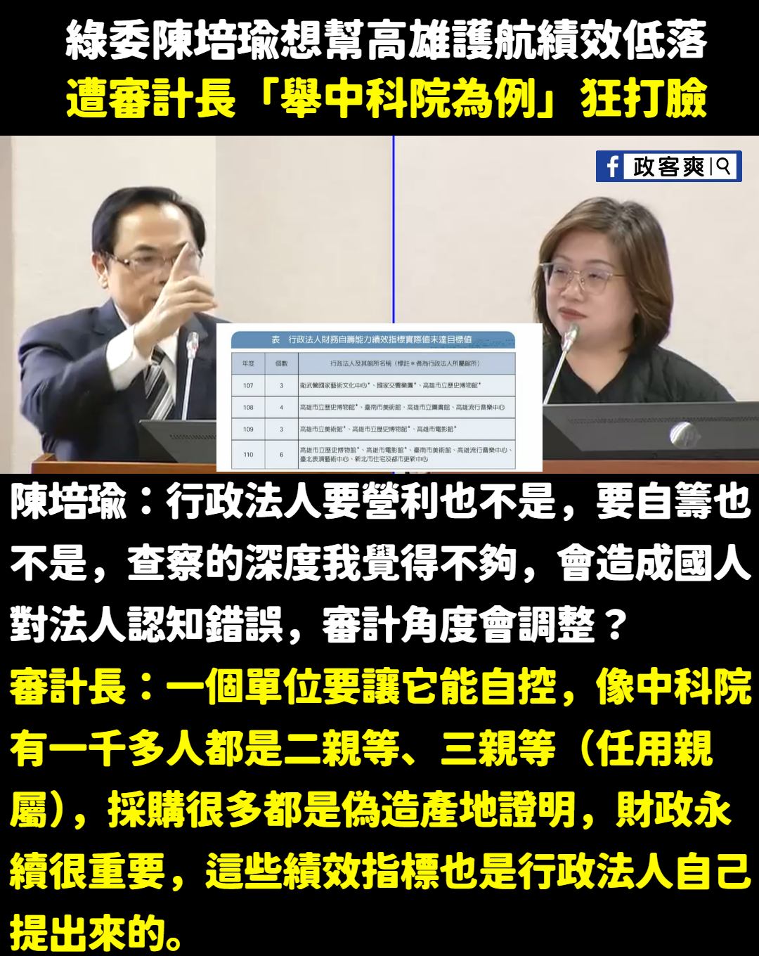 笑死,高雄有幾個蚊子館常年「自籌率」績效未達目標,民進黨立委陳培瑜跳出來想護航,審計長直接舉例中科院內部有「任用親屬、採購違規」的問題打臉