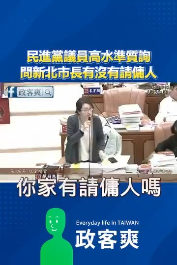 請問一下民進黨新北議員顏蔚慈,市長家裡有沒有請傭人跟新北市民的關係在哪? 眾所皆知,市議會是質詢跟市民生活有關的重要議案,第一次聽到問「市長你家有請傭人嗎?」 其實就算市長家裡請月嫂都關妳屁事啊,笑死 議員年薪幾百萬在問那北七問題,人民的錢很好花欸~ 下次乾脆討論市長家裡都怎麼煮飯的好了,也可以在市議會表演煮飯阿,好讚 轉載來源