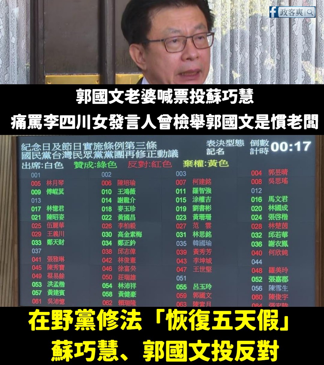 謝謝郭國文老婆出來賜劍,關於「慣老闆」直接反打到蘇巧慧、跟郭國文,他們在立法院恢復五天假的表決「都投反對票」