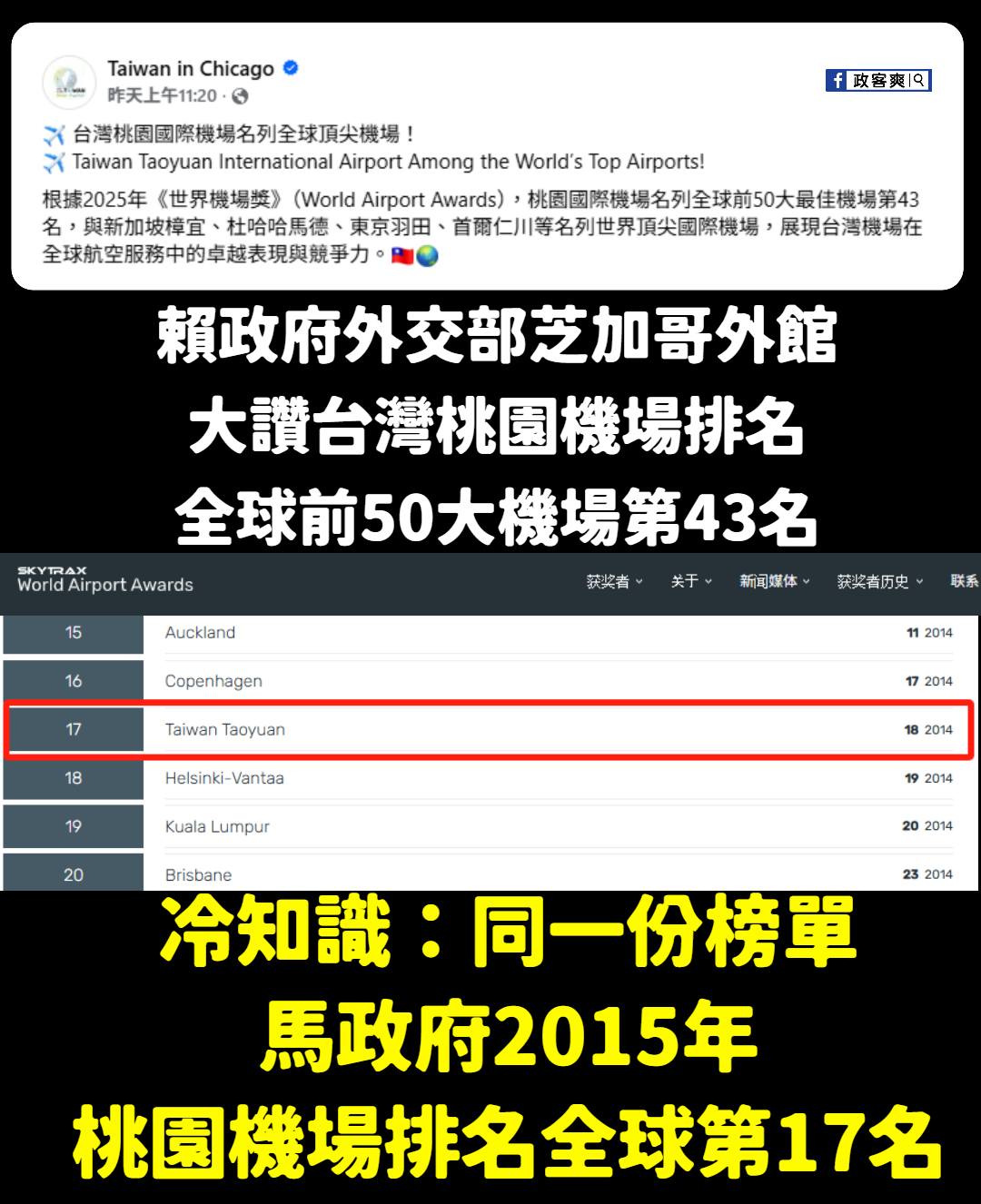 這份榜單是Skytrax 的「世界機場大獎」,是由全球旅客票選的,在2015年馬政府時代,曾經拿過全球第17名。