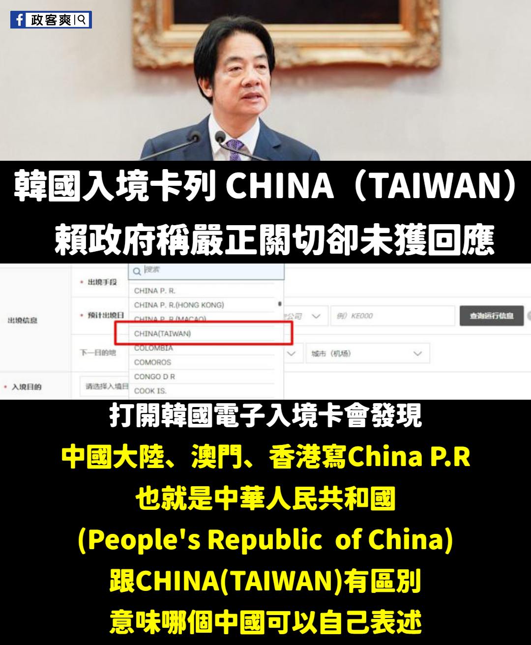 賴政府抗議韓國電子入境卡將我方寫成CHINA(TAIWAN),但其實韓國已經刻意區分雙方的不同 大陸、澳門、香港統一用的是China P.R,也就是中華人民共和國的英文,People's Republic of China 而台灣卻沒有加上 P.R,也就是這個中國的定義可以自行表述 賴政府到底是關切被吃豆腐呢?還是其實想去中化? 轉載來源