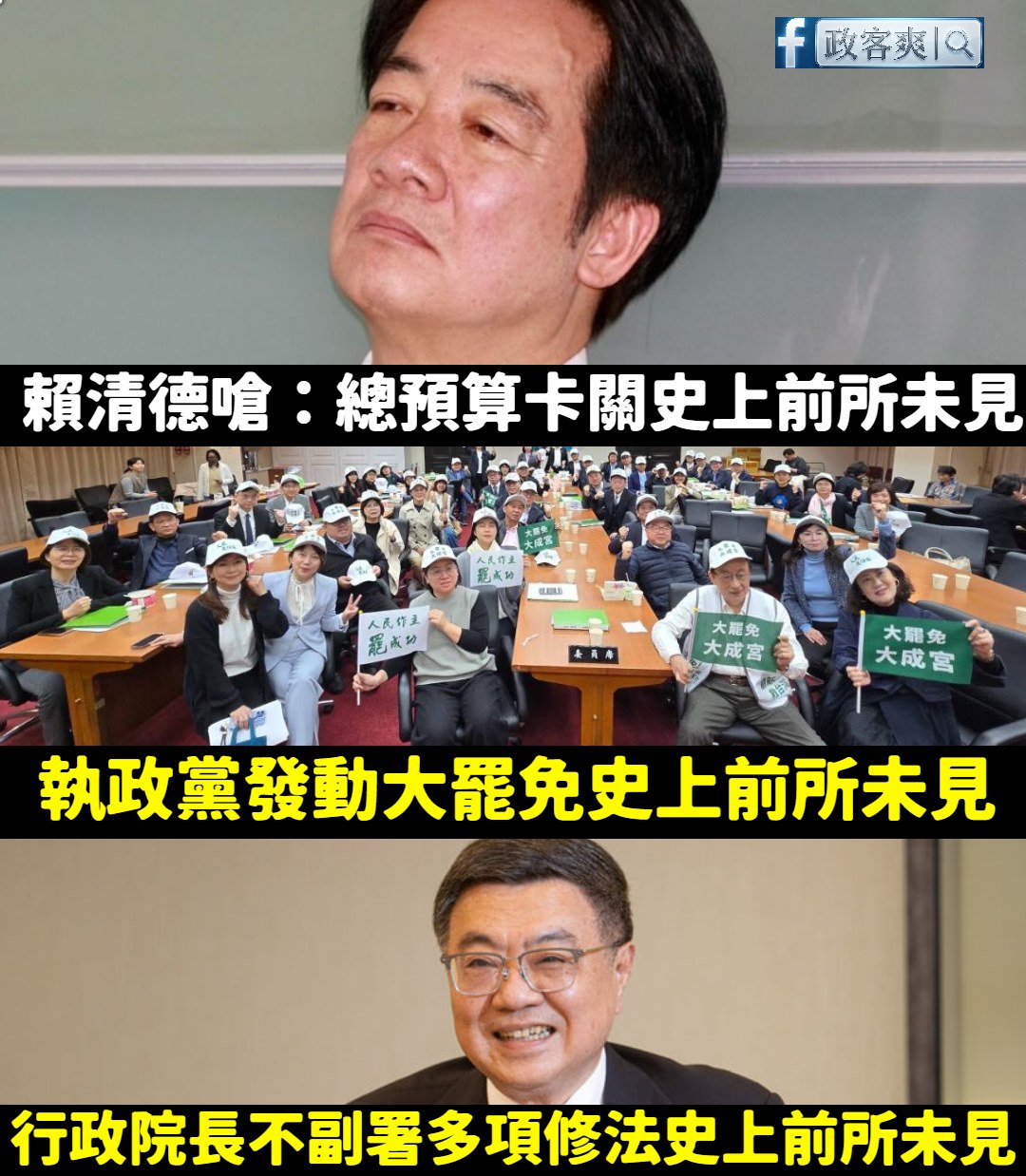 賴清德在哭爹喊娘的嘴在野黨卡總預算「史上前所未見」,執政黨搞大罷免也是「史上前所未見」、行政院長不副署多項在野黨的修法也是「史上前所未見」