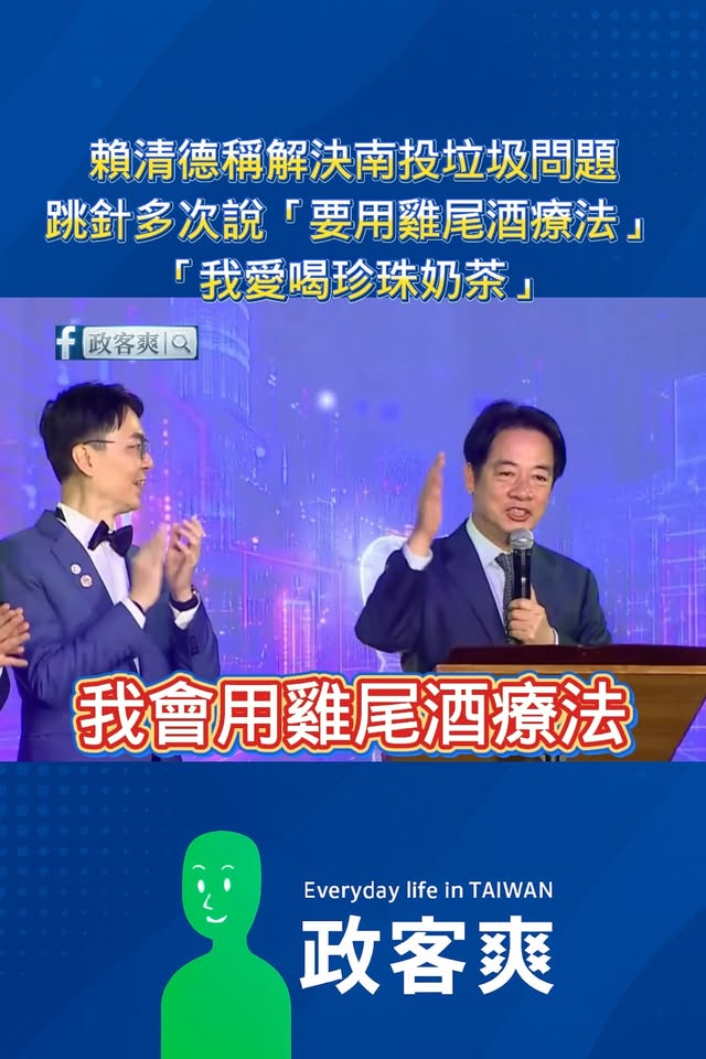 賴清德稱要解決南投垃圾問題,跳針多次說「要用雞尾酒療法」、「我愛喝珍珠奶茶」 是這樣啦,賴清德講說要處理垃圾過多的問題,講了半天重複三次「我會用雞尾酒療法」,沒人聽得懂在公啥毀。 啊不然台南、高雄焚化爐拆掉,都用「雞尾酒療法」來解決就好啦,賴總統真機智。 轉載來源