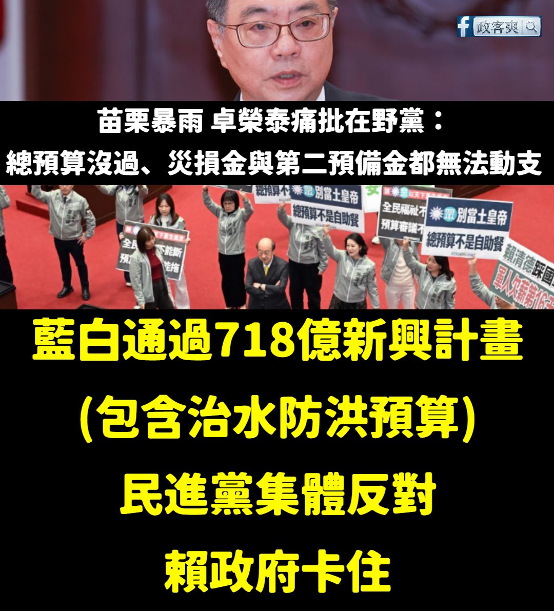 718億新興計畫(包含治水防洪預算)早就通過了,是卓榮泰在卡公文而已。