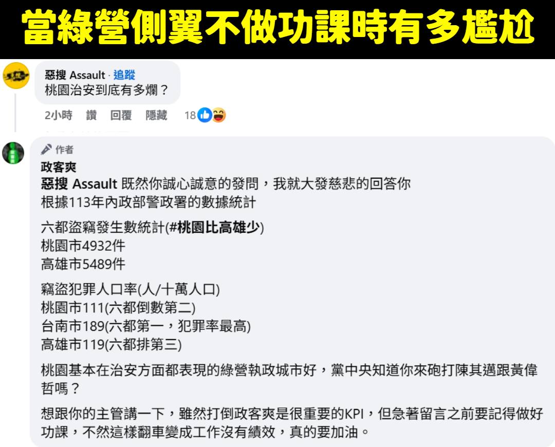 這幾年上門踢館的綠營側翼大概有幾十個,但後來越來越少,原因是因為我會拿數據打臉,怕被同溫層笑話的把我封鎖的也不少(例如:于北辰等等..) 急著完成KPI我都可以理解,但打著打著打到自己人就挺尷尬的。 台南作為賴清德的本命城市,治安這麼糟糕,應該要好好檢討吧? 砲打黨中央,讚讚,是這樣嗎?不是哦,不是這樣子。 轉載來源