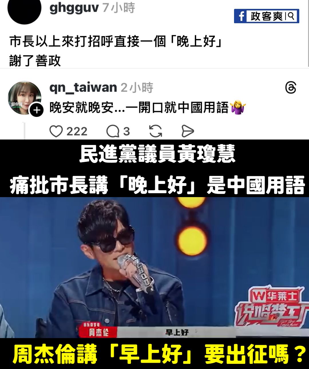 通常支語警察就是一堆極端青鳥在做的事情,結果現在民進黨議員黃瓊慧也跳下來擔任支語警察,檢討張善政講「晚上好」。 那個周杰倫講過「早上好」,黃瓊慧要不要再發一篇批判周杰倫講「早上好」是中國用語? 我笑妳不敢。 轉載來源