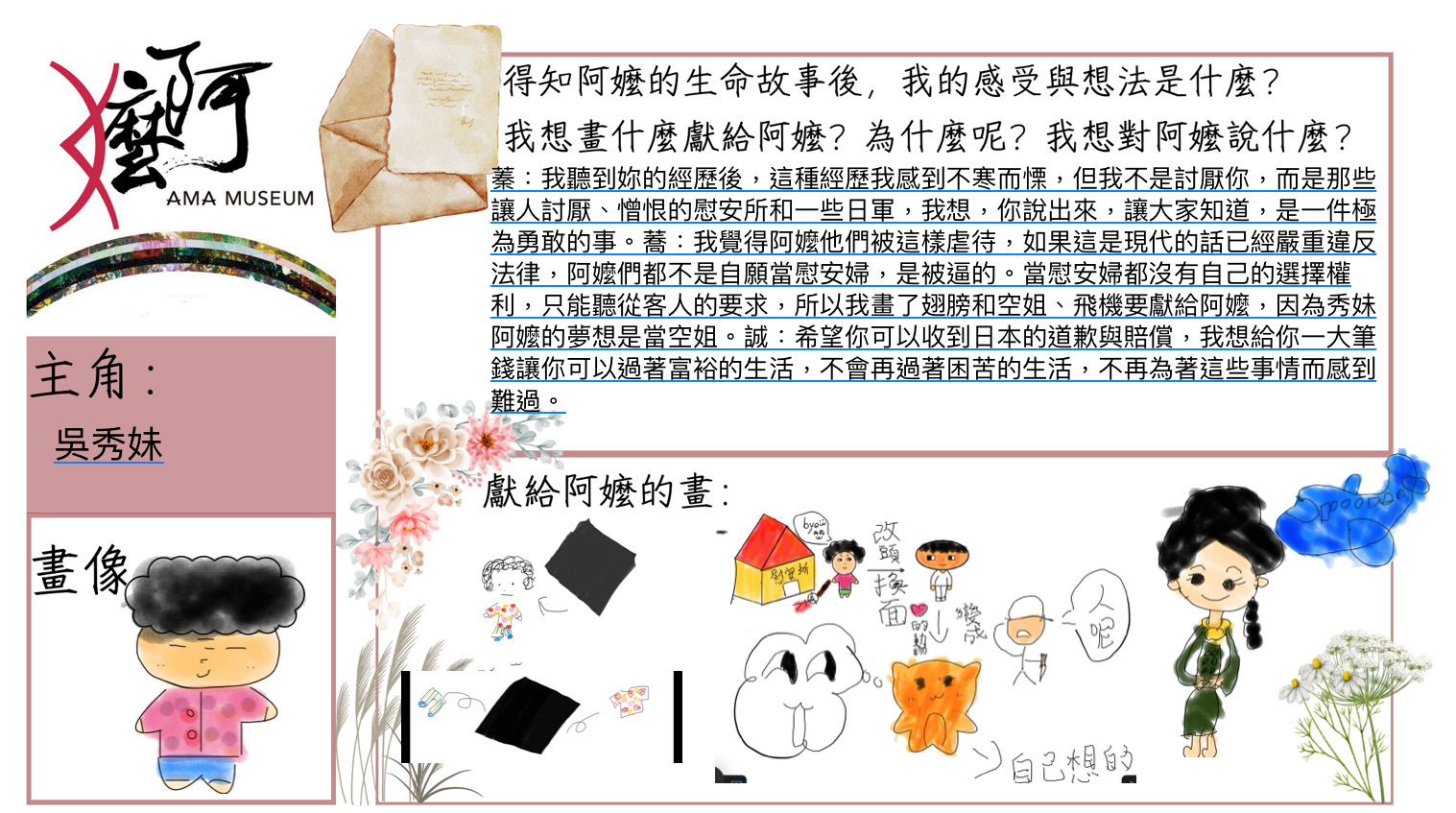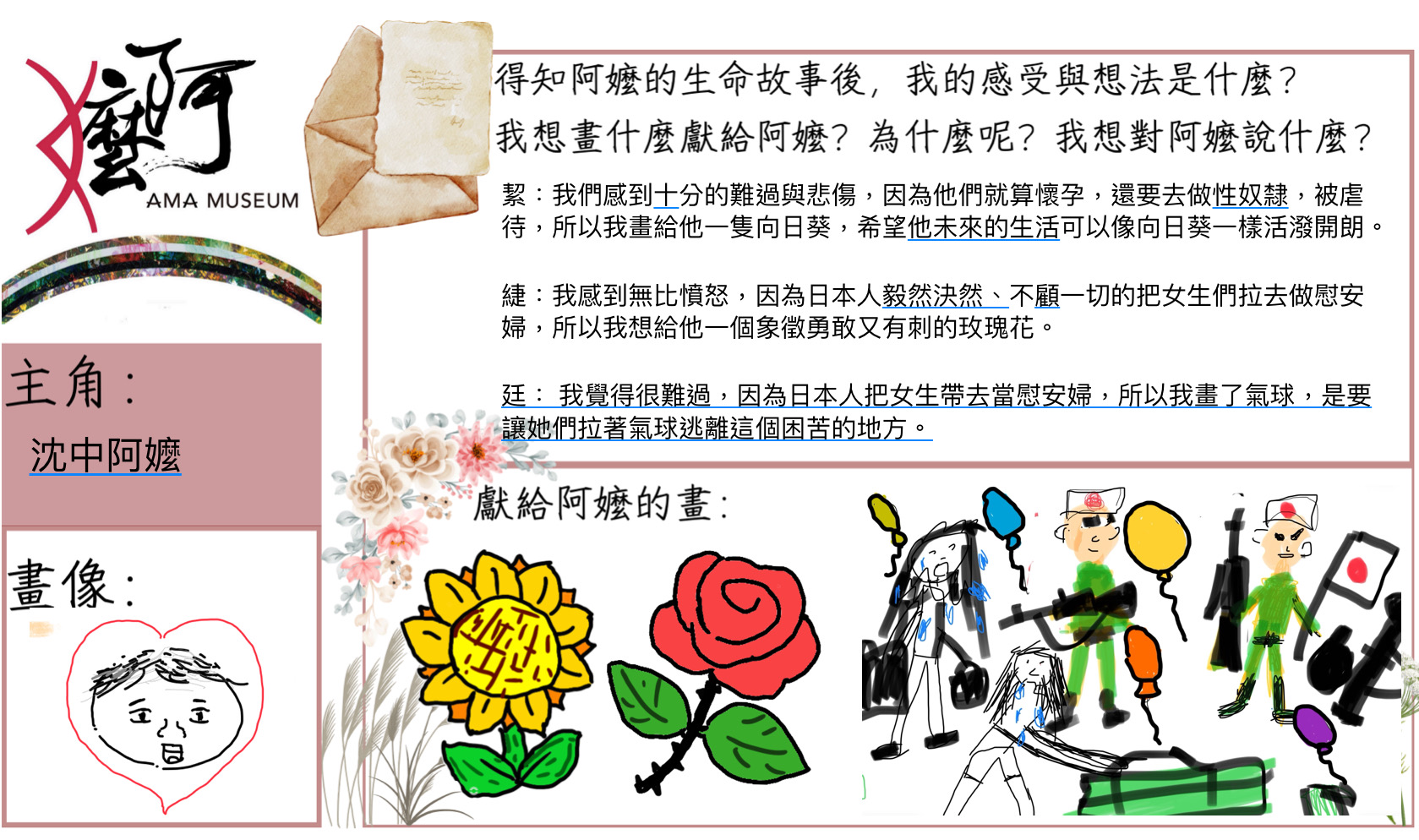 因此,我們看見了非常動人的創意:有孩子送上飛機或麥克風,希望阿嬤們能圓自己晚年的夢;也有孩子想像自己穿梭時空,回到阿嬤受難的年代,遞上一顆氣球,好讓阿嬤能藉此逃離慰安所。這些畫作與想像既純真又深刻,讓人心頭一暖。